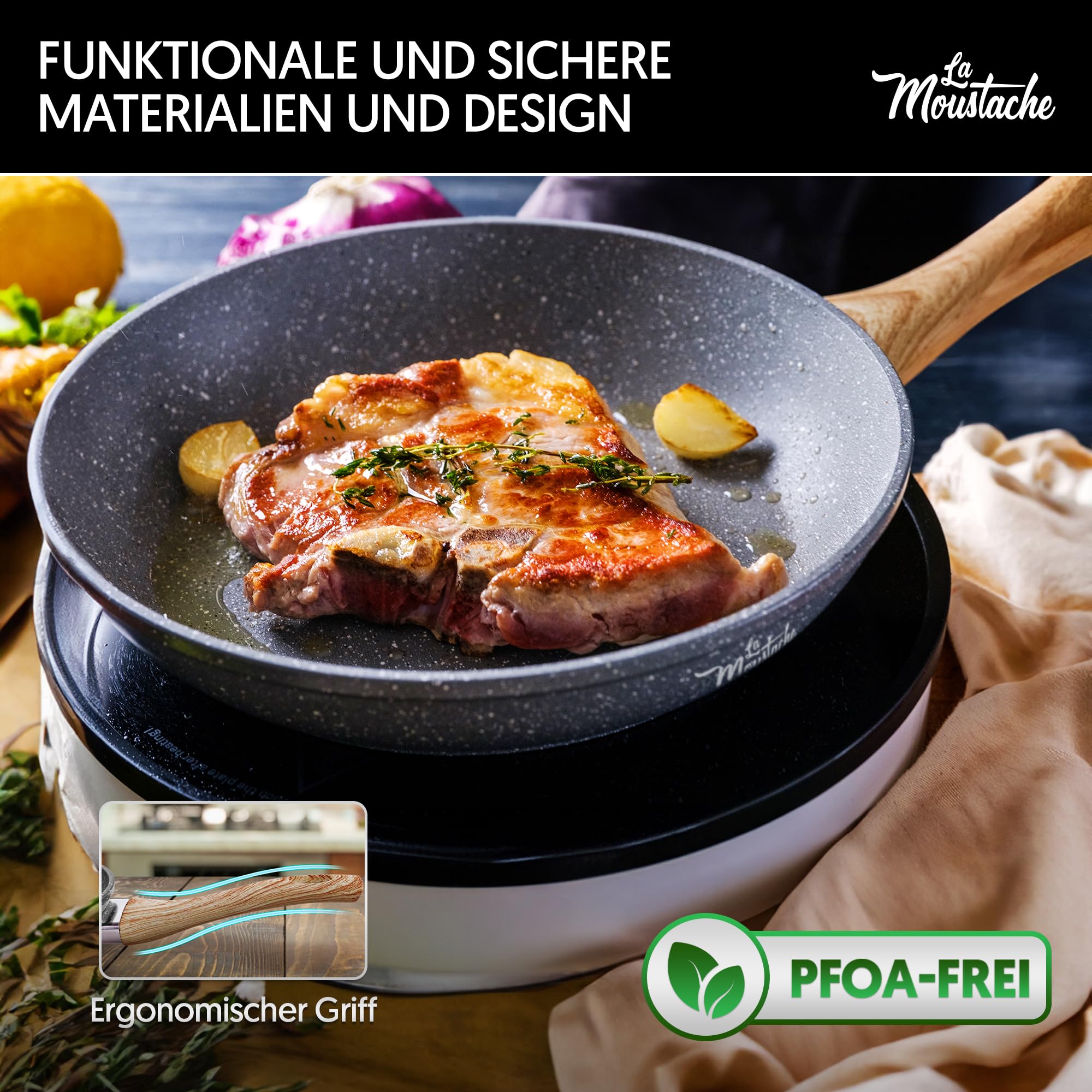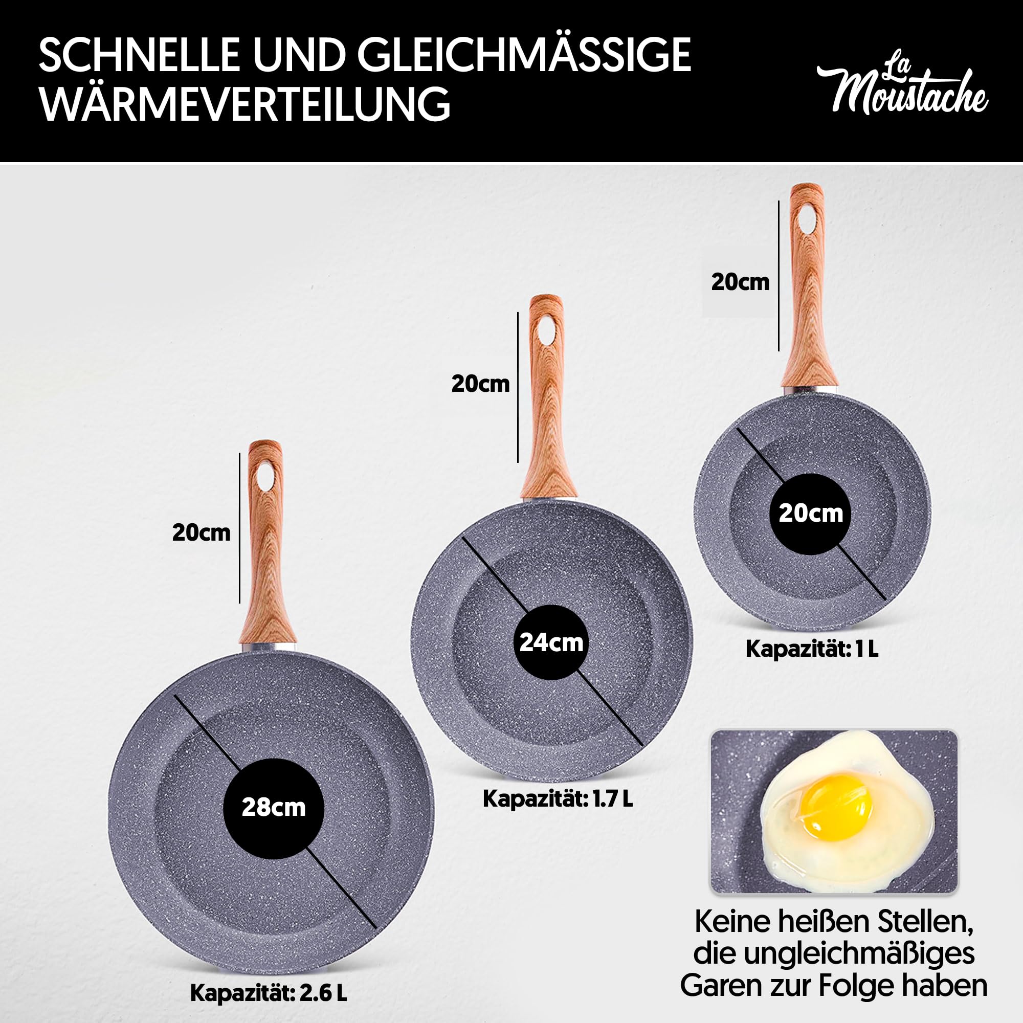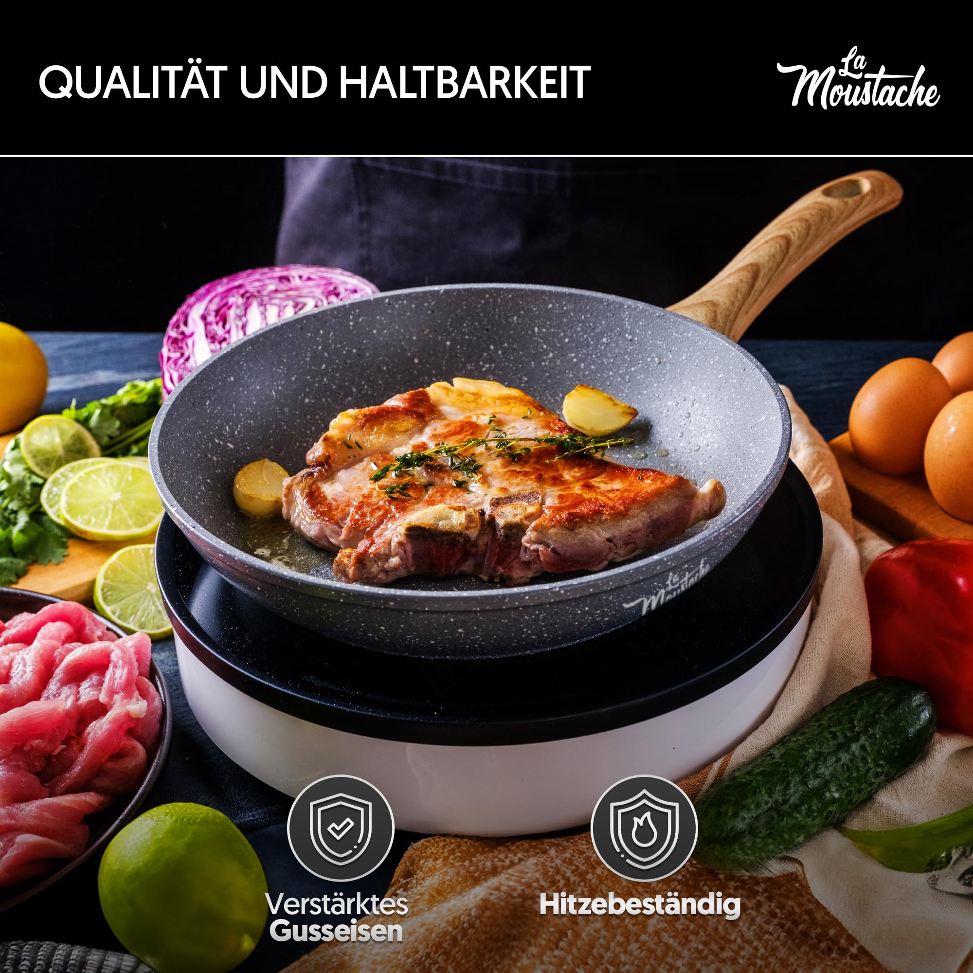 La Moustache - Set mit 3 Bratpfannen 20/24/28 cm, Aluminiumguss mit Antihaftbeschichtung für Alle Herdarten, auch Induktion, PFOA-Frei, Verbrühungshemmende Griffe (Quilmes)