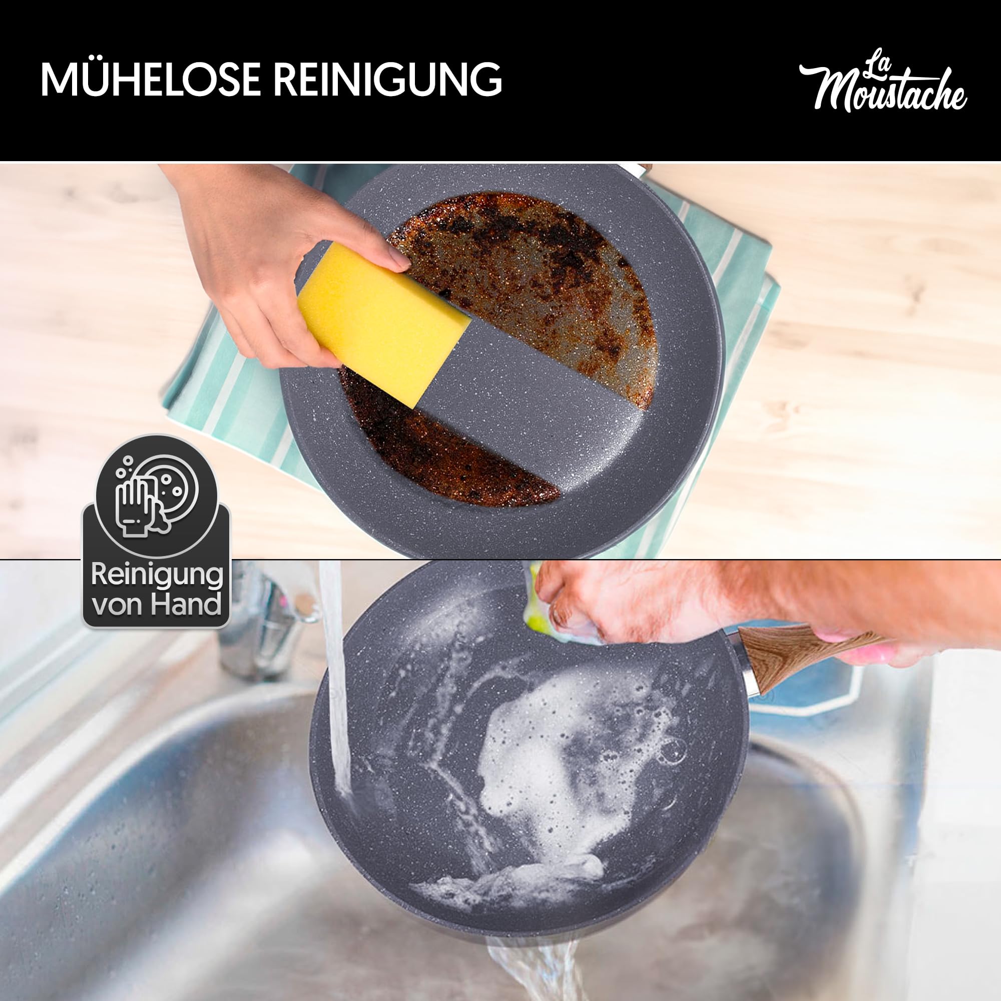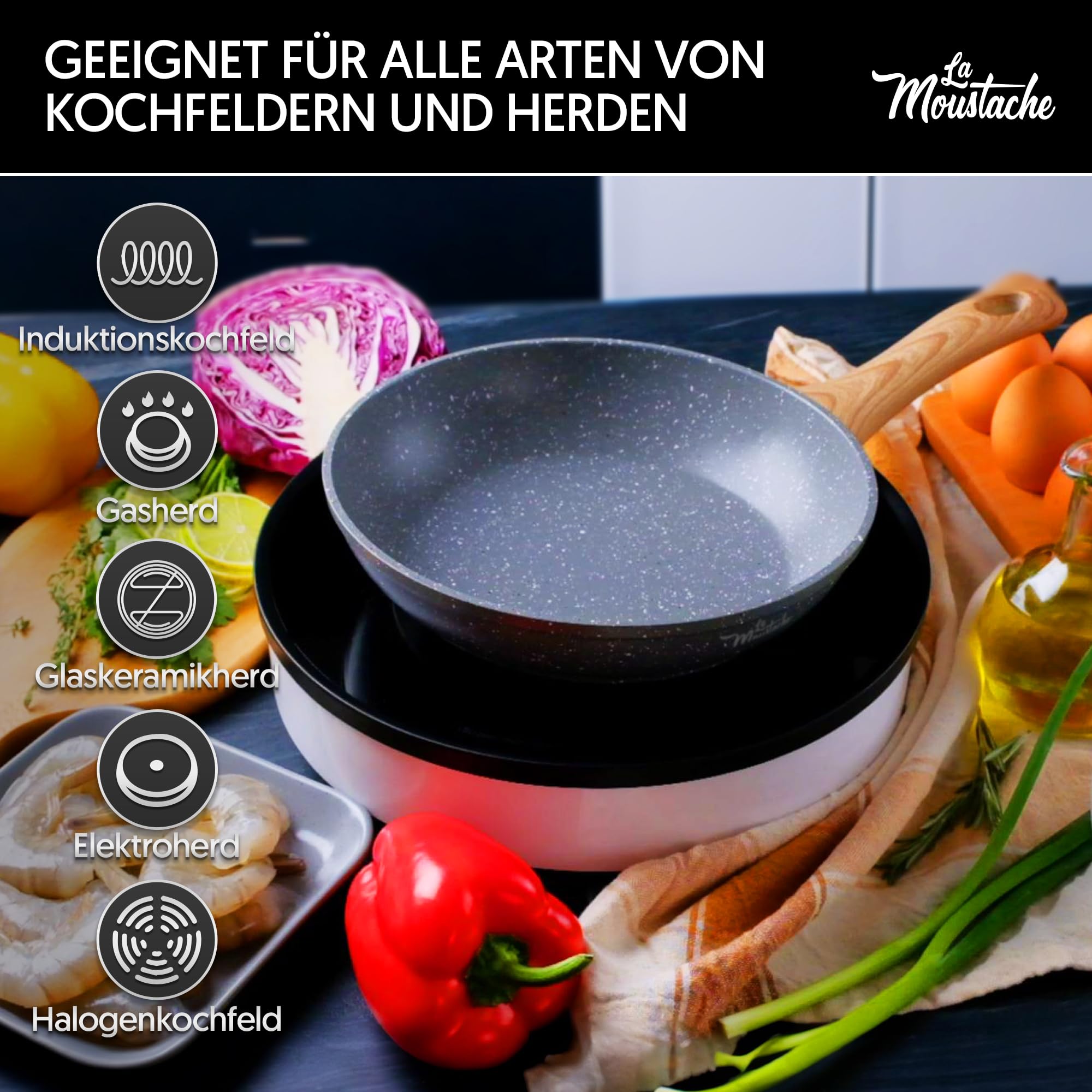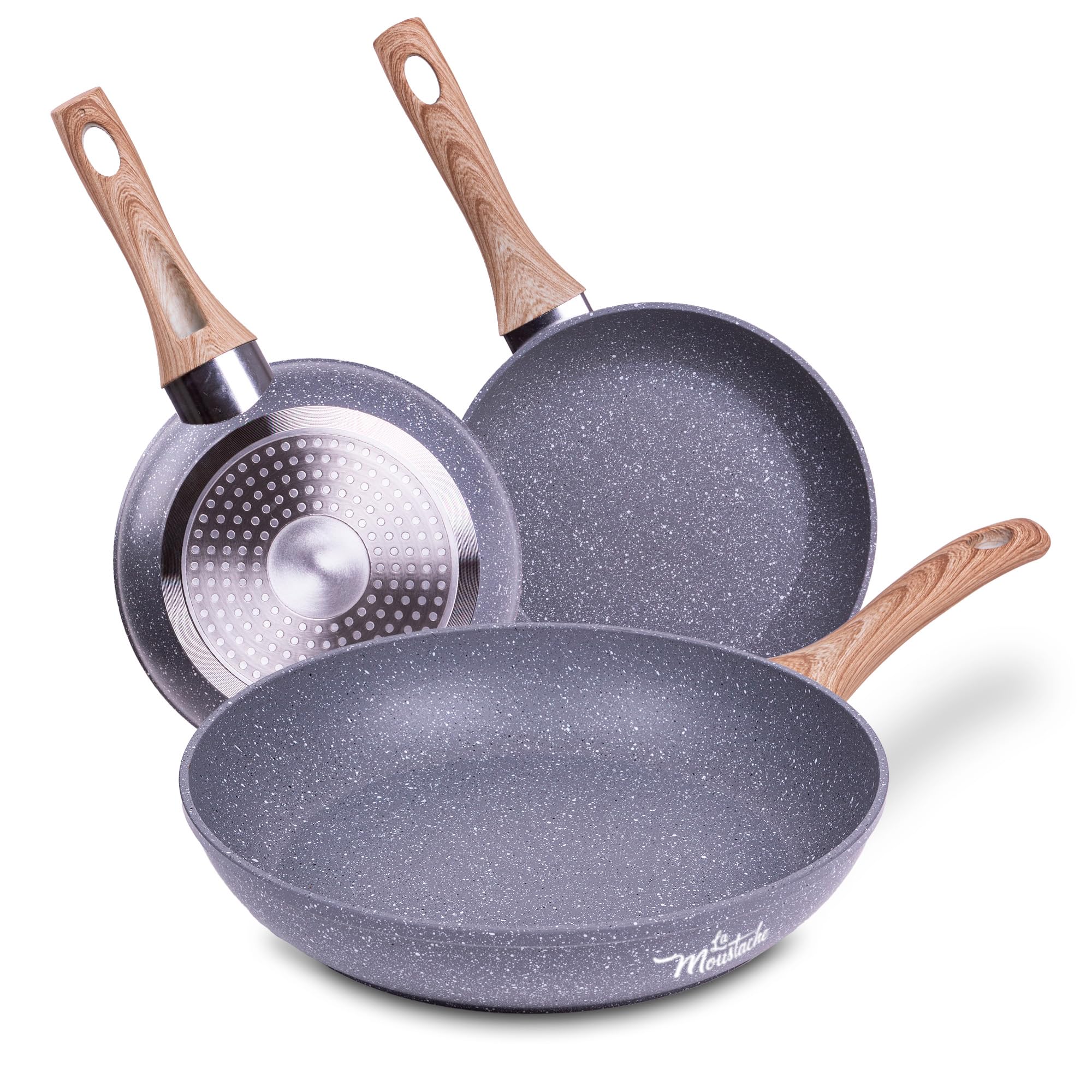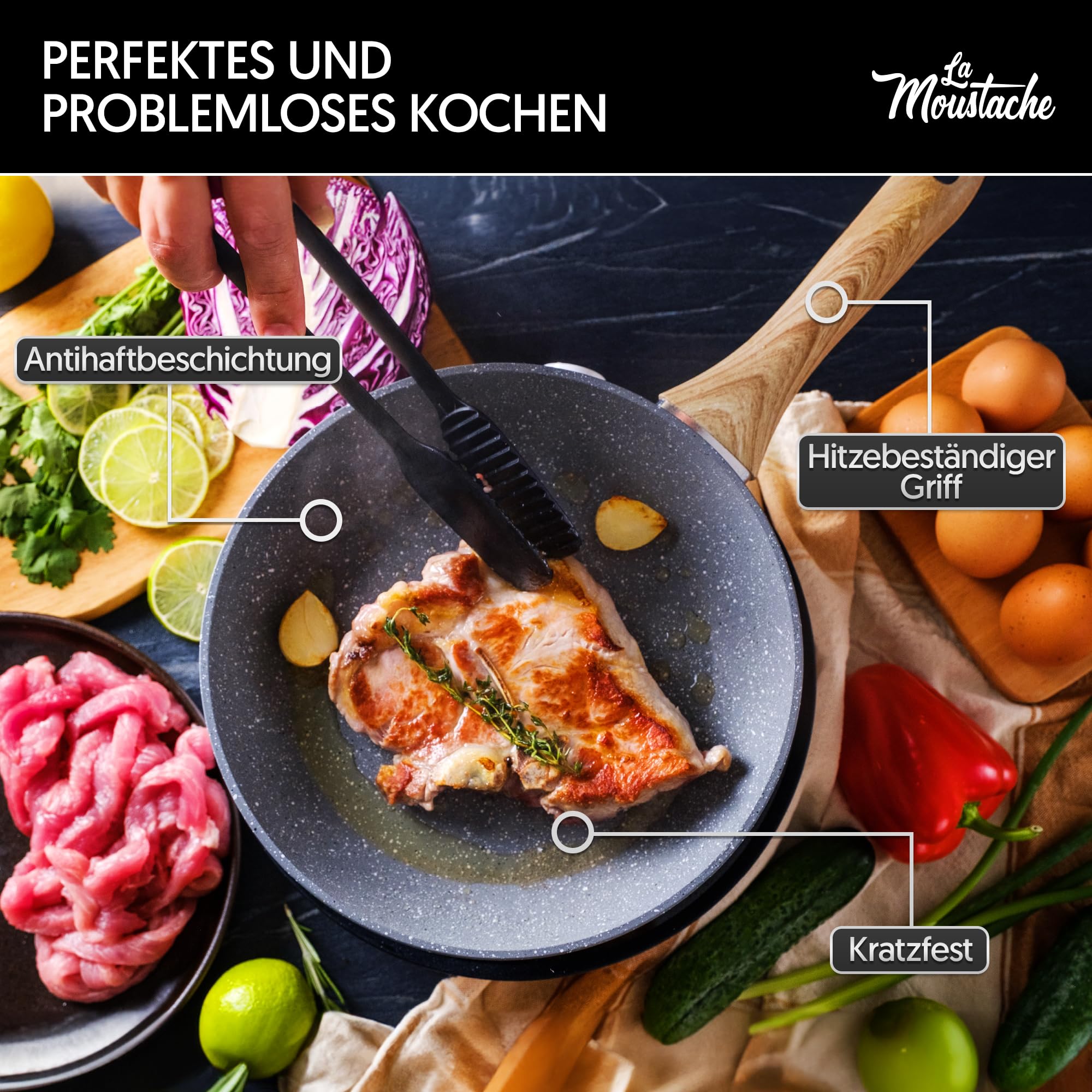 La Moustache - Set mit 3 Bratpfannen 20/24/28 cm, Aluminiumguss mit Antihaftbeschichtung für Alle Herdarten, auch Induktion, PFOA-Frei, Verbrühungshemmende Griffe (Quilmes)